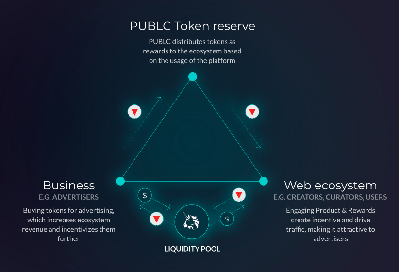 The cash USD coming in from businesses and advertisers is converted to stablecoin USD and automatically buys PUBLX tokens from circulation via a liquidity pool, at the PUBLX/USD market rate. The PUBLX received from the conversion is paid to the Token Reserve(\*), which results to taking those PUBLX tokens out of circulation and creating deflation.