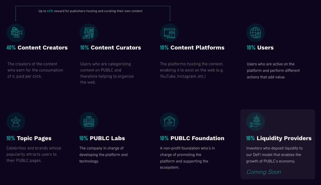 * **Tokens distributed as a factor of PUBLC platform usage:** One of the core business principals of any online content platform is that its value is measured by its usage by users, the more users there are on the platform the more valuable the platform is to businesses and advertisers. In order to maintain a healthy balance between PUBLX token supply and demand, the triggering for distribution of the PUBLX tokens is the usage of the PUBLC platform, thus distributing more PUBLX as platform's value grows.  &#x20;